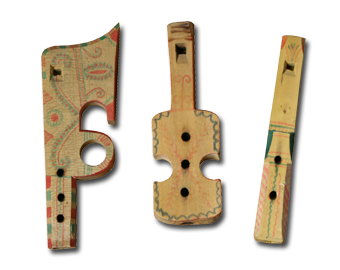 Na slikama odozgora prema dolje su: dječje žveglice iz Zagorja (u obliku pištolja, bajsa i jedinke), guslice od kukuruzovine i lijepo izrezbarena drvena čegrtaljka.